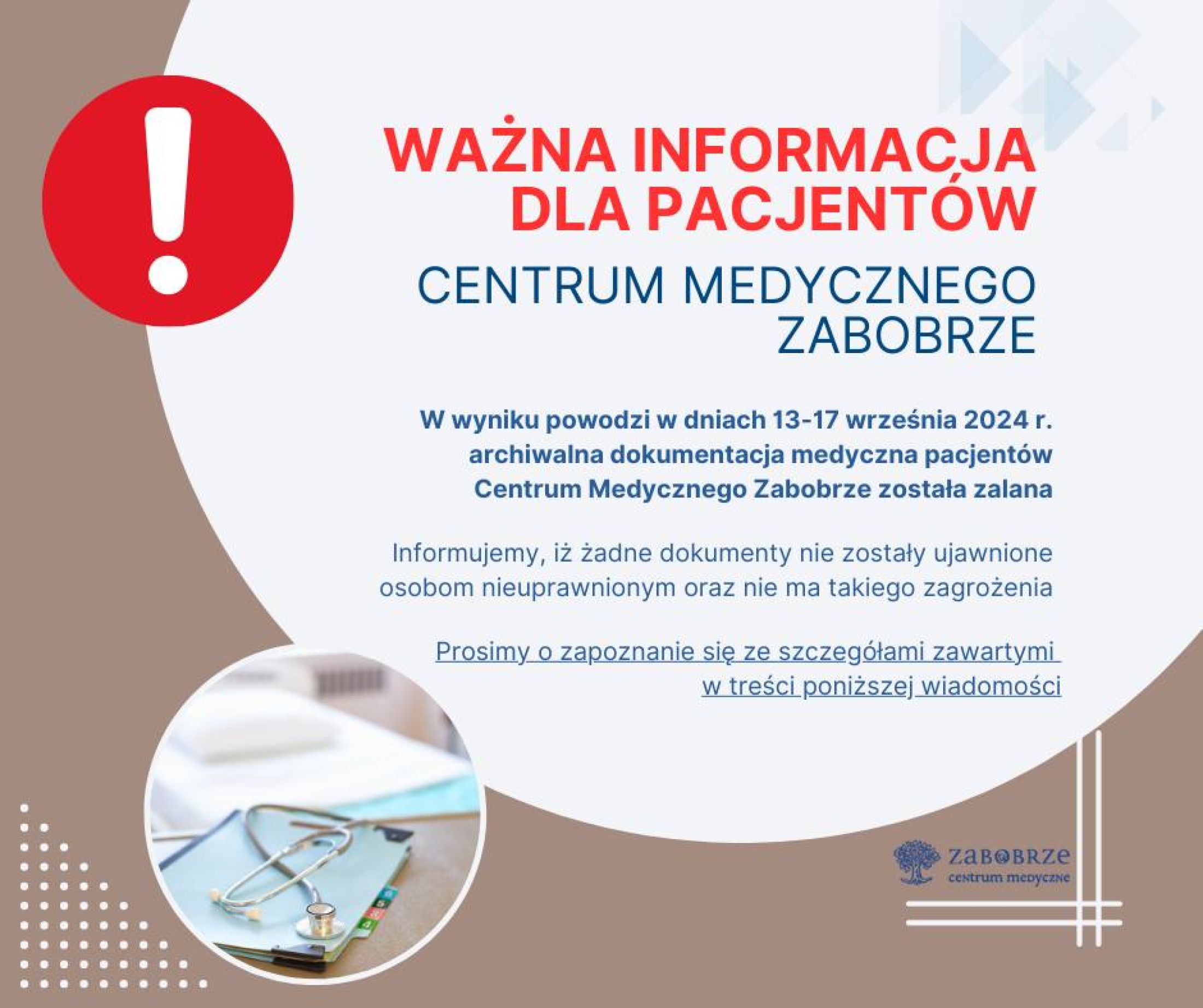 informujemy, że w wyniku powodzi, która miała miejse w dniach 13-17 września 2024 r. archiwalna dokumentacja medyczna pacjentów Centrum Medycznego Zabobrze została zalana.